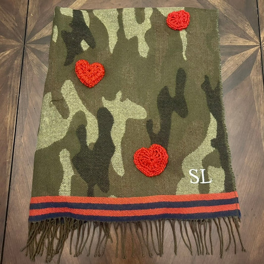 Mark & Graham Green Camo Oversized Scarf with Crocheted Hearts
