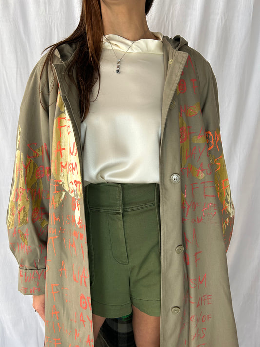 Real Snow Milk Graffiti Hooded Trench Coat with Zip Lining