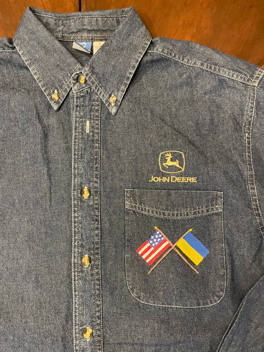 UKRAINE & US Hand-Painted Flags on Denim John Deere Shirt