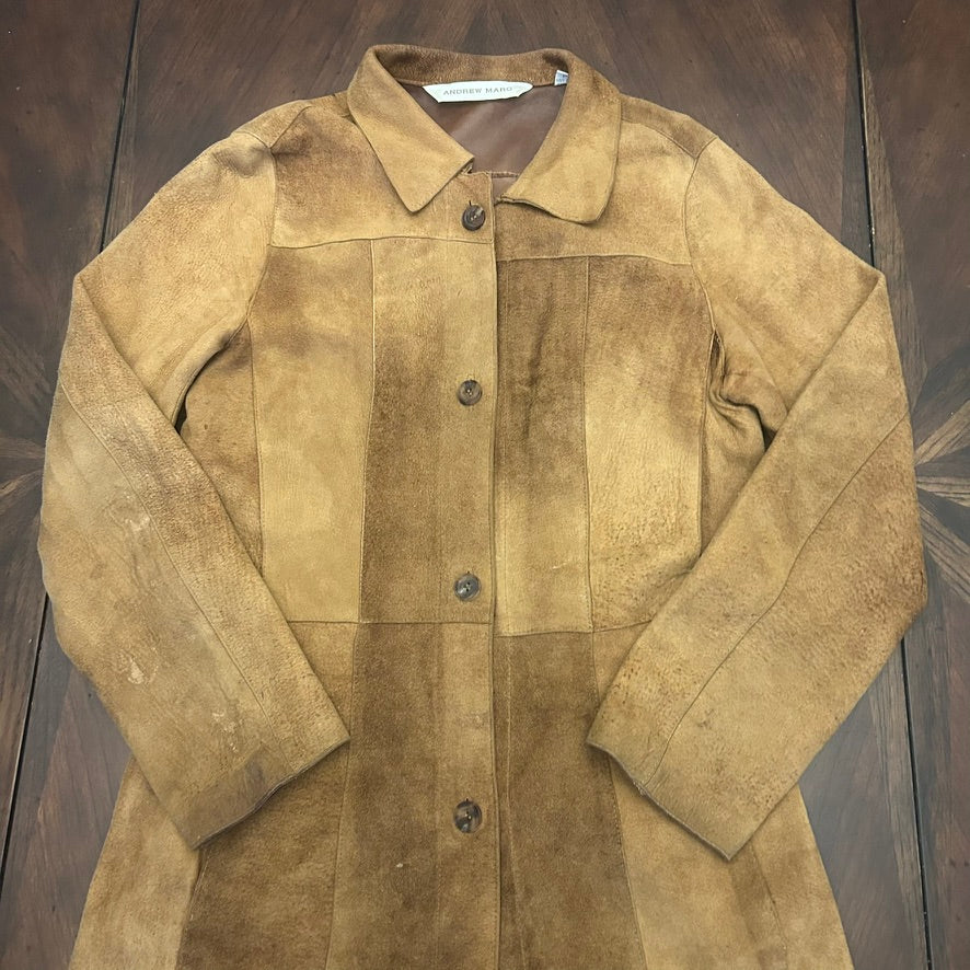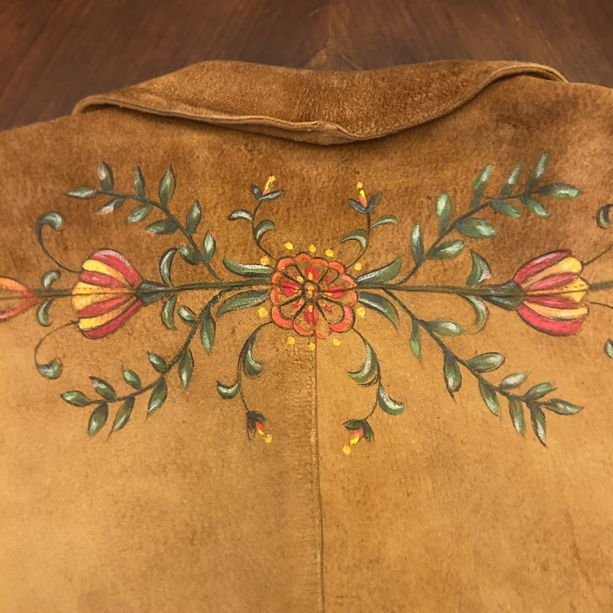 Andrew Marc Suede Button-Front Long Shirt Jacket with Hand-painted Floral