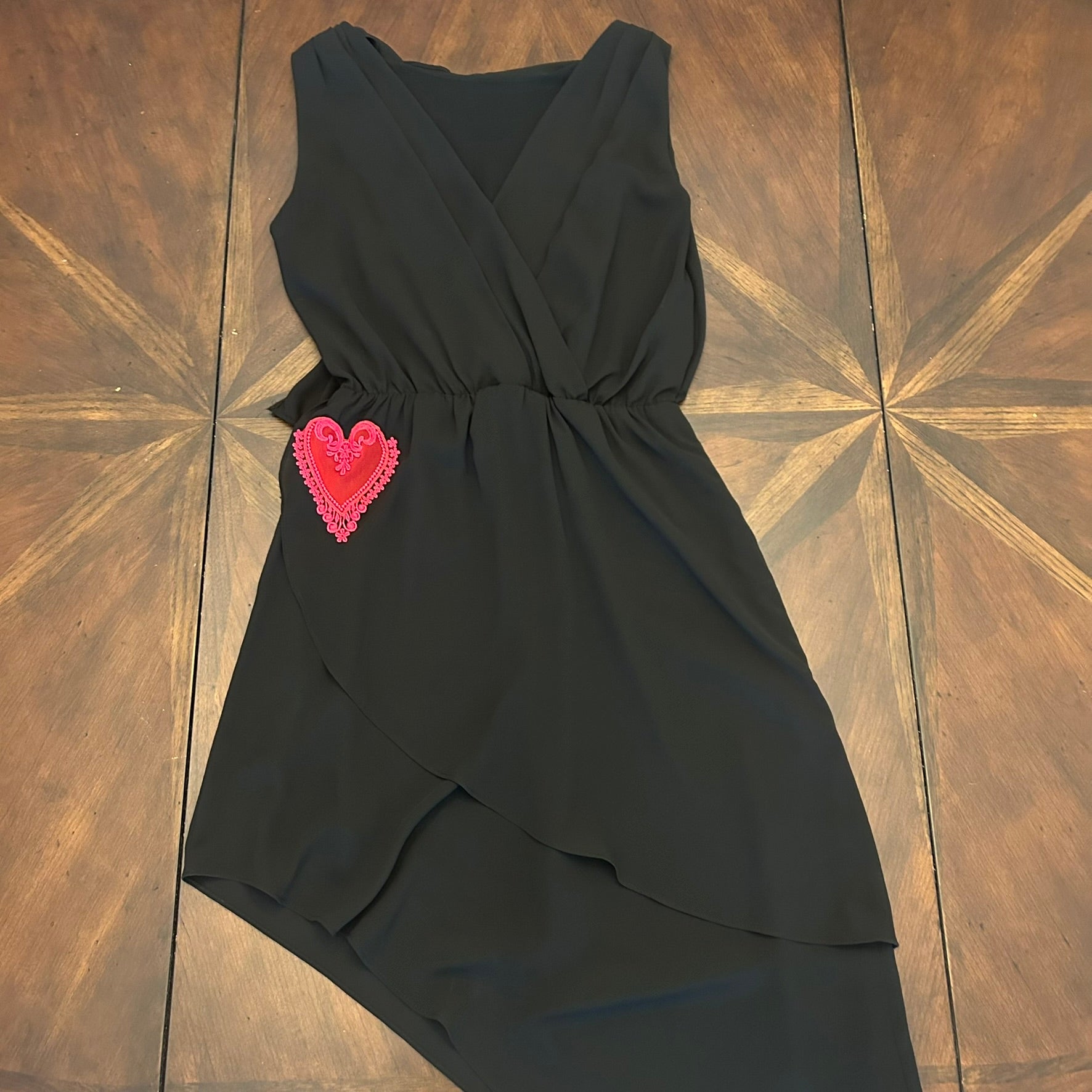 Pookie & Sebastian Black Asymmetric Crepe Dress with Heart Applique