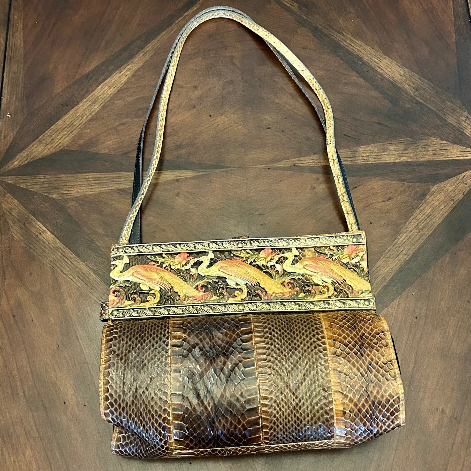 Vintage Alain Fourdraine Paris Snakeskin Bag with Peacock Frame