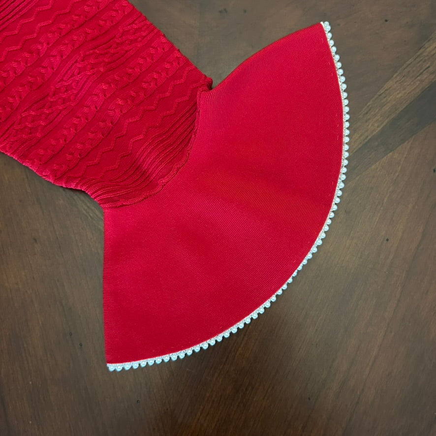 Carolina Herrera Red Cable Jewel 3/4 Sweater and Faux Pearl Sleeve Trim