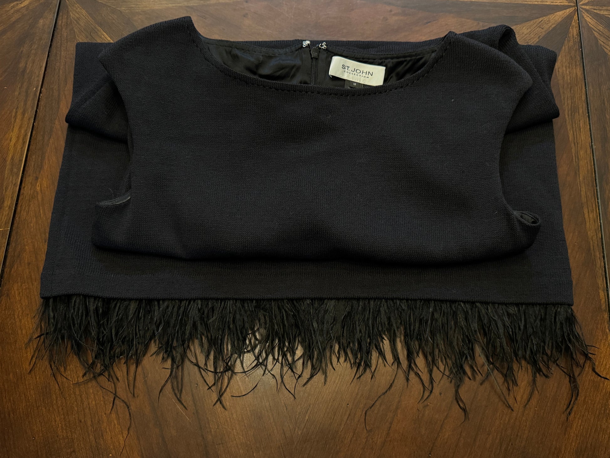 St. John Knit Sleeveless Navy Sculpted Dress with Added Feather Trim