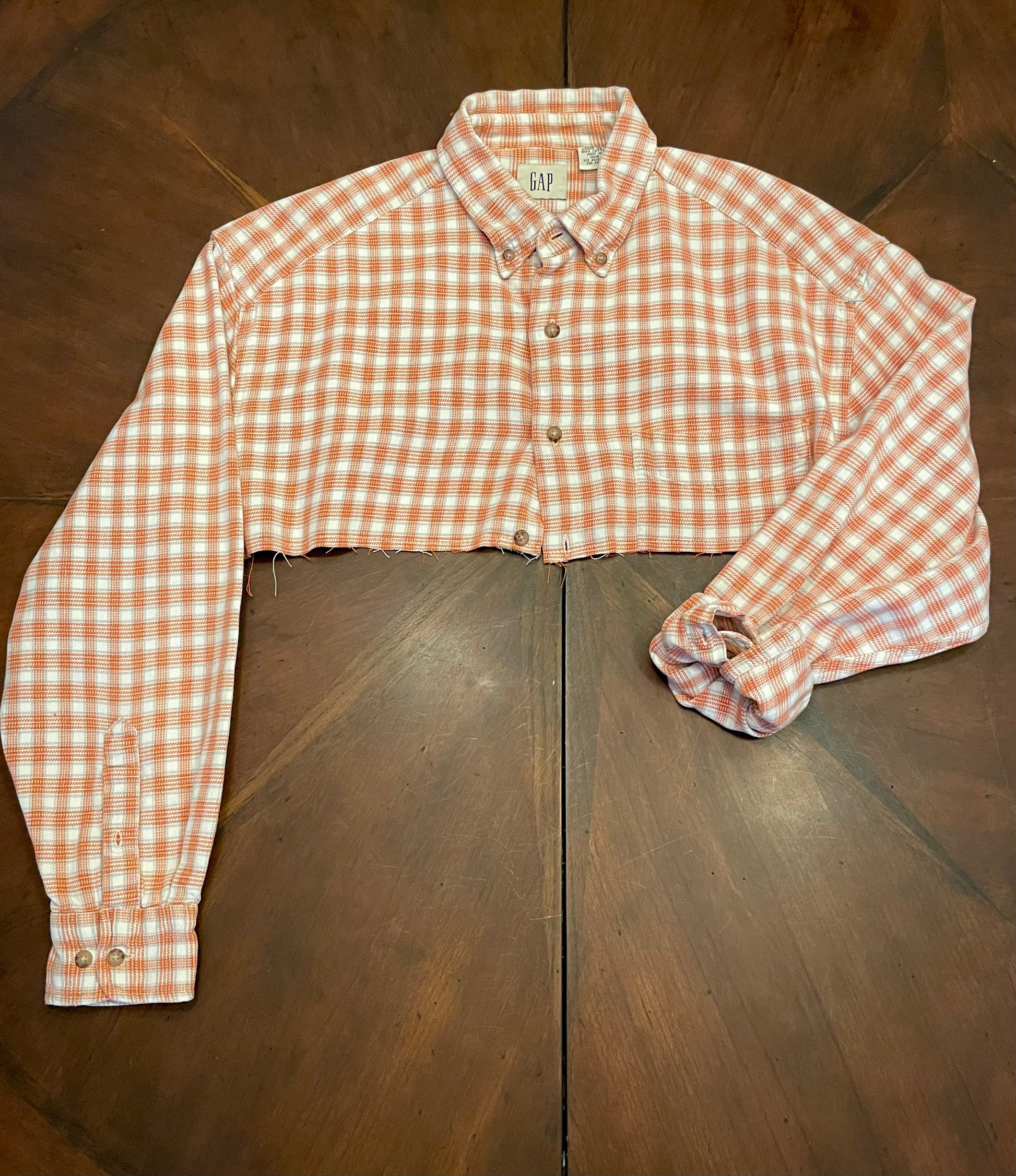 Gap Cropped/Frayed Tangerine & White Plaid Button-front Shirt
