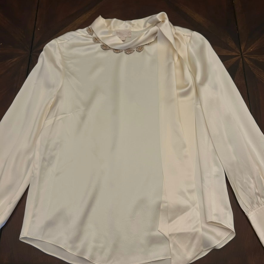 J. Crew Collection Ivory Long-Sleeve Side-Tie Charmeuse Blouse with Beading on Collar