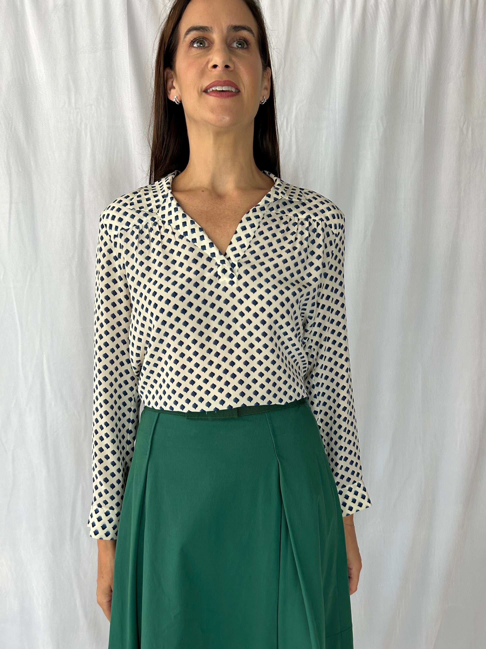 Gerard Darel Ivory with Navy Leaf Print Split Collar Blouse