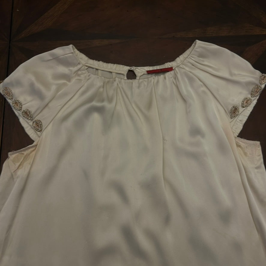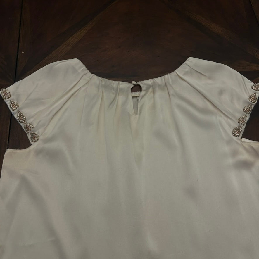 Carolina Herrera Ivory Charmeuse Jewel-Neck Cap-Sleeve Blouse with Beading on Sleeves