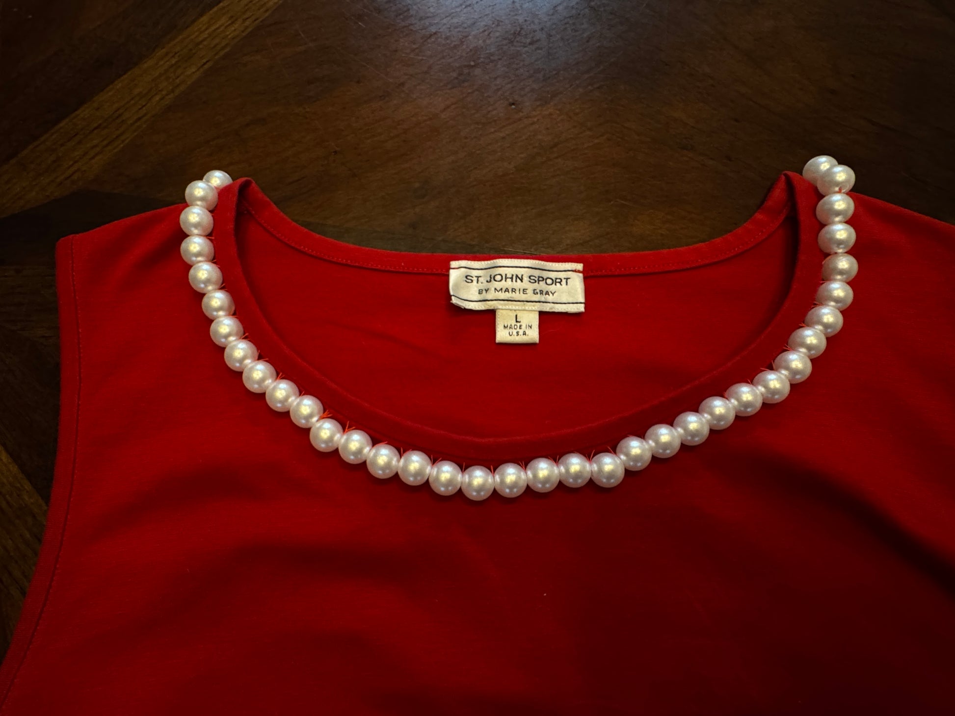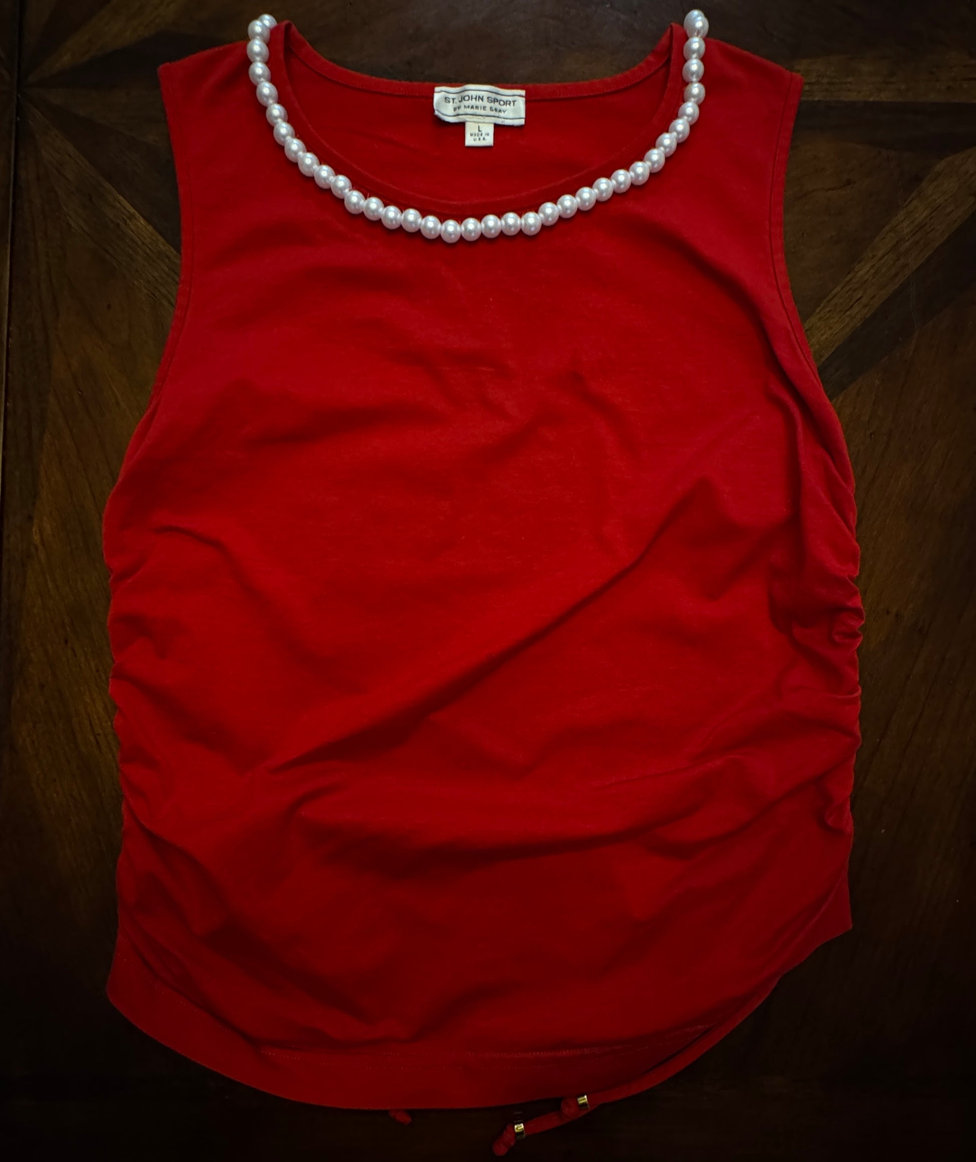 St. John Sport Red Crewneck Tank with Faux Pearl Trim